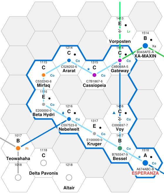 It was here that humanity had its first encounter with aliens. Esperanza lies at the end of a branch off the Main that was claimed by the Xa Imperium. Three years after first-fall, the colonists were amazed to detect a vast spherical alien craft entering orbit. The haughty Xa made it clear that humans were welcome to live on their world, but that they would be expected to pay tribute in proportion to their population. The stunned colonists had little choice but to acquiesce. Esperanzans became citizens of the Xa Imperium, learned to make their own jump-1 drives, and were eventually allowed some access to other Xa worlds.